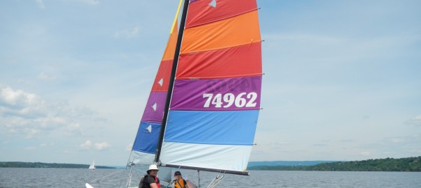 Only 3 boats showed for race night with very light winds but when we approached the start line the winds picked up to 12 kts or so and gave us a great couple of races. The odd configuration sent Carla in the wrong direction not once but twice with Ken in the steady lead. She caught him on a few legs but lost the challenge after a tough fight. Jean gave Liz her first intro to Cat sailing with smiles all around. They put in a competitive effort but the diminishing wind offered no breaks for the Hobie in the end and they were not able to finish the last race.